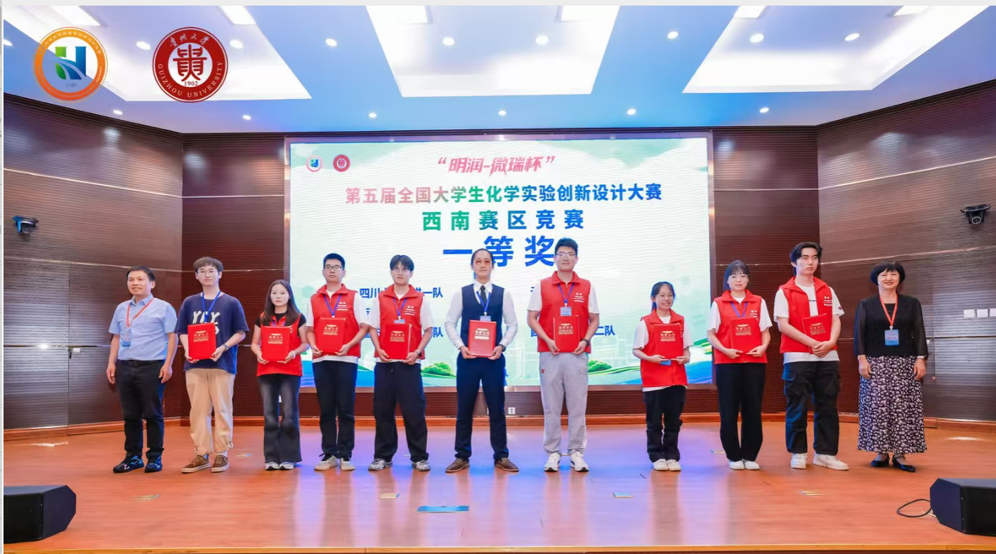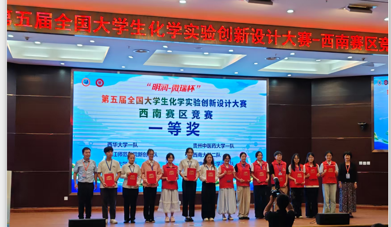 7月下旬由教育部高等学校化学类教学指导委员会和高等学校国家级实验教学示范中心联席会共同主办,贵州大学承办的“明润-微瑞杯”第五届全国大学生化学实验创新设计大赛西南赛区决赛,来自四川大学、重庆大学、云南大学、贵州大学等西南地区80所高校187支队伍同台竞技。参赛成绩由作品成绩(50%)和现场答辩成绩(50%)组成。每个学校的入围决赛的队伍都在一个小组,而且每个学校只有成绩最好的队伍参与排序。我院派出的三支队伍,通过大赛作品,视频专家评审,现场答辩等环节,三支队伍在开拓者小组赛中脱颖而出,取得小组第1(西南大学1队:子博、曹钦赤、古良东,指导老师:邹浩琳、李帮林,参赛作品:“水循微隙”—游走在纸基隧道里的咖啡精灵,科普赛道;直接进入全国赛,(西南大学2队:段海林、赵颖、钟文玉,指导老师:谭克俊,参赛作品:基于酸性橙 II 染浴原位绿色降解的环保实验开发,改进赛道)(西南大学3队:苏慧妹、付佳仪、岳永霞,指导老师:臧中林、蔡桂鑫,参赛作品:布洛芬手性合成与表征实验的改进及创新——绿色电化学插羰,改进赛道),均获得一等奖,是唯一所有三支参赛队伍获一等奖的高校。由于一个学校只能有一支队伍晋级参加全国总决赛,西南大学1队代表我校直接进入全国总决赛。